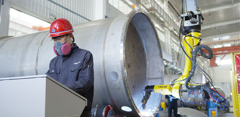 壓力容器車間建筑面積近19000平方米,擁有山東省技術(shù)監(jiān)督局頒發(fā)的A2級(jí)壓力容器制造及設(shè)計(jì)許可證,配有X射線探傷機(jī)、超聲波探傷機(jī)、光譜分析儀、大型數(shù)控激光板材下料設(shè)備、全自動(dòng)激光型材下料機(jī)、重型三輥卷板機(jī)、四輥卷板機(jī)、刨邊機(jī)、埋弧自動(dòng)焊、管板自動(dòng)焊、高速數(shù)控鉆、焊接機(jī)器人、等離子焊、大型立式車床等設(shè)備設(shè)施。車間不斷提升裝備智能化水平,優(yōu)化資源配置,為用戶提供高品質(zhì)壓力容器產(chǎn)品及解決方案。